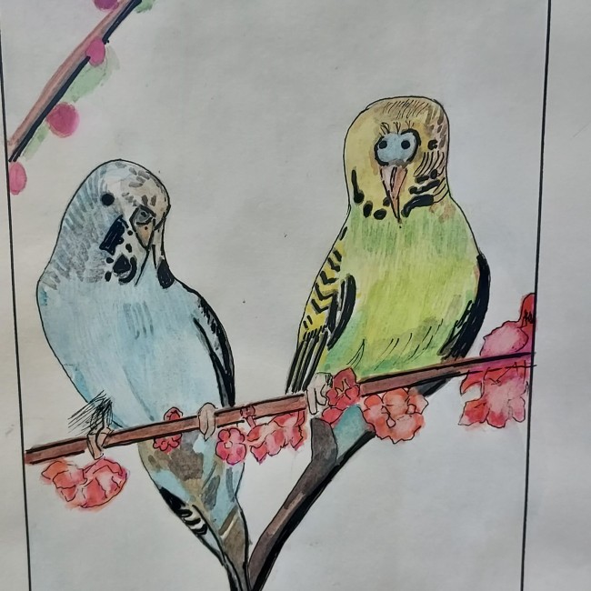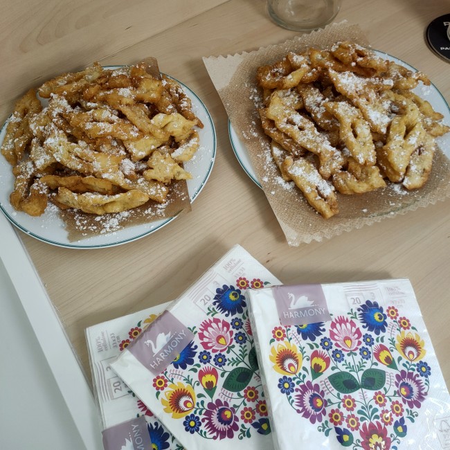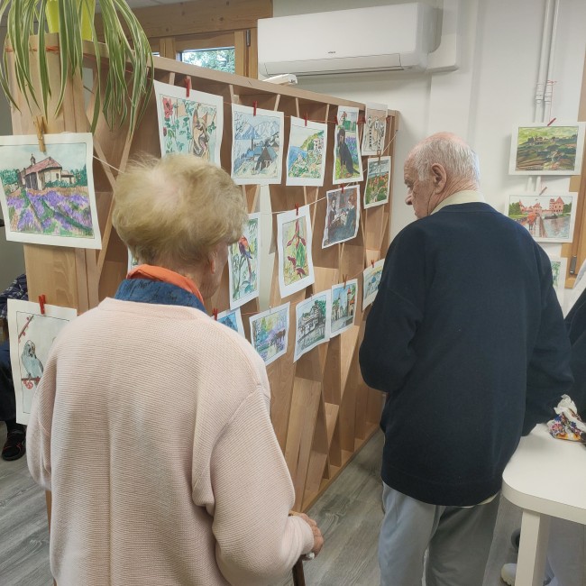 Dégustation de beignets faits maison, devant l'exposition des tableaux de Monsieur VAURS (résident).